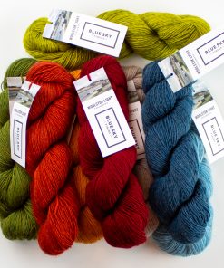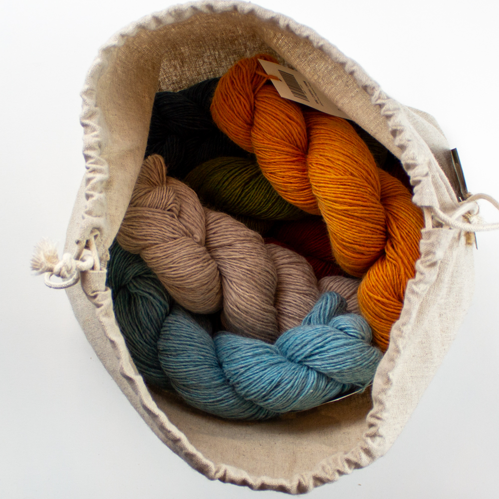 Kit includes: 8 hanks of yarn, knitting pattern instructions, and medium drawstring project bag